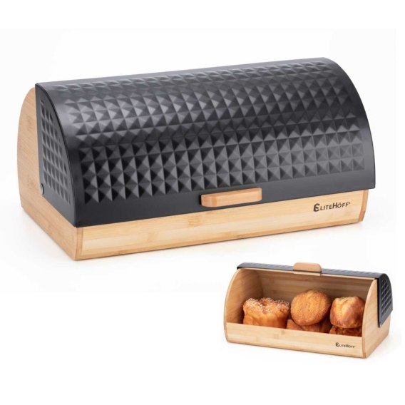 Nowoczesna forma chlebaka, jego efektowny kształt oraz połączenie metalu w czarnym kolorze z bambusem świetnie prezentują się na blacie.