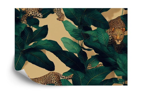 Fototapeta Seamless Tropical Pattern With Exotic Trees, Leopards, And Palm Leaves. Abstract Jungle Pattern With Leopards, Digita