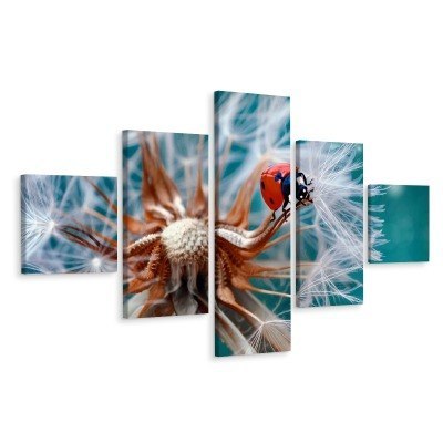 Obraz Wieloczęściowy Biedronka Na Mniszku Lekarskim W Skali Makro Canvas 250x150 LBS-3957-C250-150_1X50-150_2X50-100_2X50-50