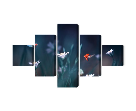 Obraz Wieloczęściowy Biedronki I Polne Kwiaty W Skali Makro Canvas Naturalny 250x150 LBS-3947-NC250-150_1X50-150_2X50-100_2X50-