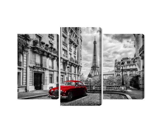 Obraz Wieloczęściowy Czerwony Samochód Retro Na Tle Wieży Eiffla Canvas 120x80 LBS-2260-C120-80_1X40-80_2X40-60