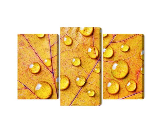 Obraz Wieloczęściowy Krople Wody Na Jesiennym Liściu Makro Canvas Naturalny 90x60 LBS-3819-NC90-60_1X30-60_2X30-45
