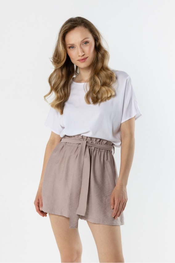 Lekkie szorty o swobodnym kroju to idealny wybór na ciepłe dni. Wysoki stan z marszczoną talią pięknie podkreśla sylwetkę, a wiązanie w pasie dodaje całości kobiecego charakteru. Luźniejsze nogawki zapewniają wygodę i swobodę ruchów, a praktyczne kieszenie zwiększają komfort noszenia. Model świetnie sprawdzi się w codziennych, letnich stylizacjach.